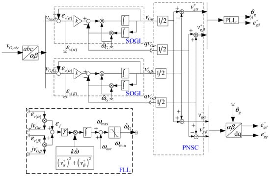 The block diagram of DSOGI-FLL is presented in Figure 8. As shown in Figure 8, DSOGI-FLL works in an frame, with two SOGIs being used to compute the symmetrical components; one for and another for . The two SOGIs are arranged in parallel to provide the input signals to the positive/negative-sequence calculation block (PNSC), which implements the transformations given by Equation (20).