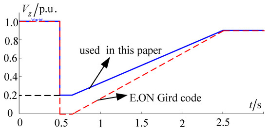 According to the E.ON grid code, wind farms must withstand voltage drops down to 0% of the nominal voltage for durations up to 150 ms, as the red curve shown in Figure 9. Depending on the network and wind farm configuration, it does not necessarily lead to zero voltages at the wind generator terminal side. A relatively simple calculation indicates that the corresponding voltage dip at lower voltage levels, near the WT terminals, is likely to be somewhat above 15% [32]. For that reason, the grid-voltage dip curve used in the paper is the blue curve in Figure 9; namely, at 0.5 s, the grid-voltage dips to 15% and lasts for 150 ms, and then, the voltage slope recovered to 90% until 2.5 s. The lowest grid voltage was set to 15% instead of 0%.