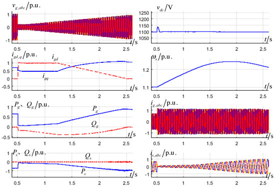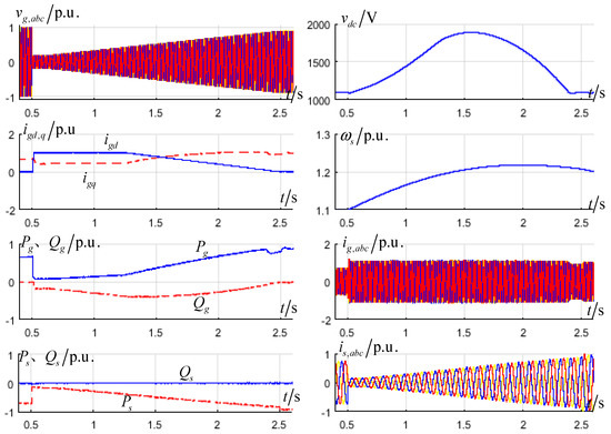 Figure 10 presents the simulation result used in the Equation (21) control method. At t = 0.5 s, the grid voltage dips to 15% p.u.; the grid-side reactive current reaches 1 p.u. according to the grid-connected requirement; the grid-side active current also reaches the upper limit of 0.4583 p.u., and the corresponding active power is 0.09 p.u. According to the control method used in Formula (21), the generator-side active current reduce to 0.15-times the initial current; it is 0.11 p.u., calculated by Equation (21). The input active power from the generator-side converter is greater than the output active power of the grid-side converter. The DC-link voltage still rises until 1.6 s. The peak of DC-link voltage is 1900 V, and it may destroy the DC-link capacitance in real physical equipment. With grid-voltage restored and the ability of the grid-side output active power increased, after 1.6 s, the generator-side active power is lower than the grid-side power, and the DC-link voltage decreases. However, the grid-side active current is still in the upper limit until 2.3 s. The upper limit of the grid-side active current changes because the reactive current required is changed with the voltage rise. At 0.23 s, the DC-link voltage controller exits saturation, and the DC-link voltage recovers to 1100 V. Because of the reduced generator-side input power, the rotor speed rises, and the peak value is 1.22 p.u. at 2.5 s; the grid voltage recovers to 0.9 p.u; the generator-side does not reduce the active power and changes to the maximum wind power capture mode.
