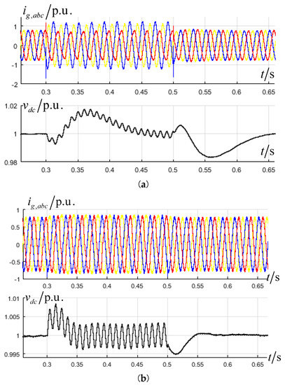 Both in Figure 12a,b DC-link voltage occurs twice for grid frequency oscillations during asymmetrical conditions and in Figure 12b, the oscillations are larger. This is because the system works with symmetric a, b, c currents and asymmetric a, b, c phase voltages, so the grid-side active power contains positive-sequence and negative-sequence components. The generator-side active power contains only the positive-sequence component.