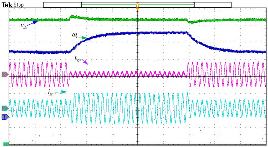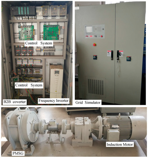 To demonstrate the validity of the proposed algorithm, the experiment has been carried out for a 10-kW PMSG wind power system (CORONA Science &Technology Company, Beijing, China). The induction motor controlled by the ABB ACS550 frequency inverter is used as a wind turbine simulator. The grid simulator used for sag generation was the PVS7030T (PARWA Technology Company, Shenzhen, China). The parameters of the experimental system are shown in Table 3. The experimental setup is shown in Figure 13.