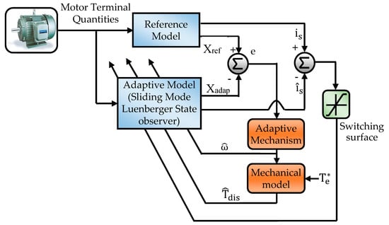 Adaptive control is mainly used for parameter adaptation. The essence of an adaptive control mechanism is to adapt to the controlled system with parameters that need to be estimated. The concept of parameter adaptive MRAS along with the parallel disturbance torque estimation mechanism is illustrated in Figure 3. There is a reference motor model and the adaptive model as a function of the parameter to be estimated. The adaptive mechanism is used to ensure that the state of the observer (process) converges to the state of the motor (plant). Therefore, we have an optimization criterion X and the error to be constrained: