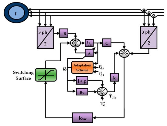 The reduced order sliding mode luenberger observer (SMLO) with the modified switching surface is shown in Figure 4, where “A” is the parameter matrix, “^” is used for estimated parameters, “X” is the state variables comprised of the d and q-axes stator currents and rotor fluxes, “ksw” is the reduced order observer switching gain matrix, chosen in such a way that the eigenvalues of the observer and the machine are maintained proportional to ensure stability under normal operating conditions. “J” is the moment of inertia, “p” is the differential operator, “BV” is the viscous friction coefficient, “” and “” is the reference model electromagnetic torque and the estimated disturbance torque, “k” is an arbitrary positive gain [17]. The purpose of a sliding mode or variable structure strategy is to modify the dynamics of a non linear system state by means of a high frequency switching surface or a sliding hyperplane. The sliding hyperplane is selected in such a way that the Lyapunov function candidate “V” utilized for obtaining the convergence mechanism, and its derivative satisfies the Lyapunov stability criterion [17,25]. “V” is a scalar function of the sliding hyperplane “S”. Therefore,