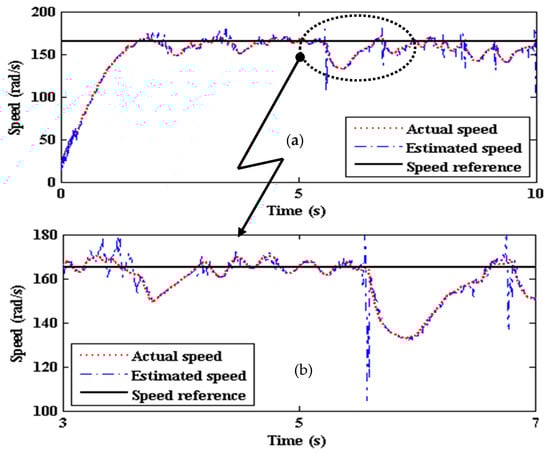 (a) Estimated speed of Modified Sliding Mode Luenberger Observer (SMLO 2); and (b) zoomed version of (a).