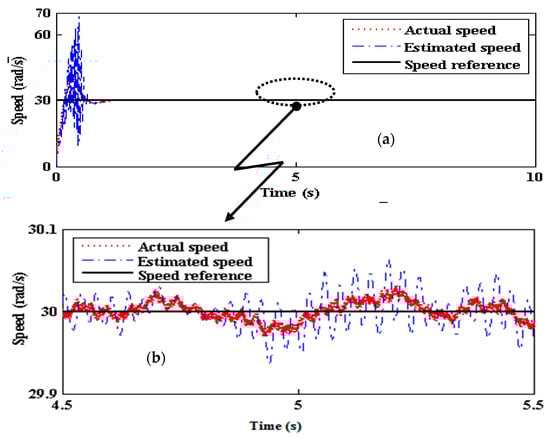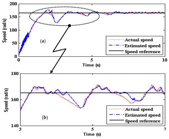 Here, the observers are tested at a low flux weakening region for a given speed command of 165 rad/s. However, both reach the reference speed at almost identical time, and the estimated speed oscillations are comparatively very high for SMLO 1 as shown in Figure 6a. In the zoomed version shown in Figure 6b, the oscillation is as high as 70 rad/s for the speed command of 165 rad/s, which is almost 42%.
