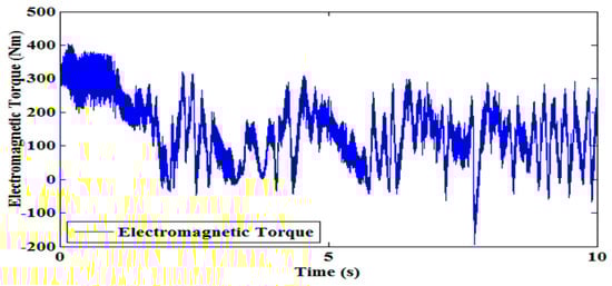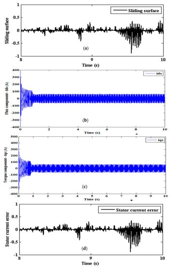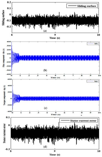 The convergence of the stator current error and the sliding surface is also observed for both the observers. In both the cases, the profile of the sliding surface is identical to that of the stator current error, as both are dependent on each other. The profile of the sliding surface, direct and quadrature axes stator currents, stator current error of SMLO1 are shown in Figure 23a–d. However, as compared to SMLO 1, both the stator current error and the sliding surface of SMLO 2 are slightly displaced in the negative range. This can be primarily due to change in the configuration of the sliding surface, as, along with the stator current error, it also has to constrain the effect of the estimated disturbance torque. The direct and quadrature axes are also obtained. The performance of SMLO2 is shown in Figure 24a–d.