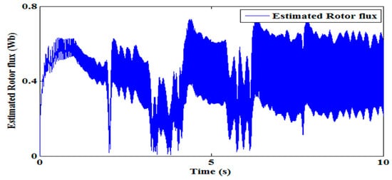 The profiles of the estimated disturbance torque in Figure 7 and the electromagnetic torque in Figure 8 of SMLO1 are almost the same, since the viscous friction coefficient and the inertia constant are of a low value. The estimated rotor flux of SMLO 1 in Figure 9 has more oscillations and the magnitude is increasing with time. As compared to SMLO 1, speed performance of SMLO2 has relatively less oscillations shown in Figure 10a. In Figure 10b, although there is an initial overshoot and undershoot, the oscillation is initially around 20 rad/s, which is around 12%, and gradually dies out after 6 s.