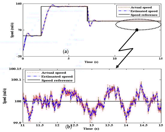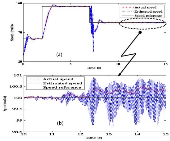 The difference is seen more distinctly at step speed command (initially 50 rad/s, after 2 s, stepped upto 150 rad/s, after 7 s, stepped down to 100 rad/s), which covers a wide speed bandwidth. SMLO 1 initially, tracks well for both 50 rad/s and 150 rad/s, but, during deceleration from 150 rad/s to 100 rad/s, there is a very high spike in the estimated speed (of almost 100 rad/s) shown in Figure 14a, which could prove detrimental to the drive system. This is mainly due to the sudden change in the flux level of the motor and SMLO 1, which directly affects its speed convergence. Even after settling down at 100 rad/s, after about 10 s, oscillations persist ranging between 98.5 and 101 rad/s, shown in Figure 14b. SMLO 2 in comparison tracks more smoothly and accurately, even during deceleration as shown in Figure 15a. The oscillations in the estimated speed are greatly reduced as shown in Figure 15b, ranging almost between 99.9 and 100.1 rad/s, which proves that it is near accurate and superior tracking as compared to SMLO 1.