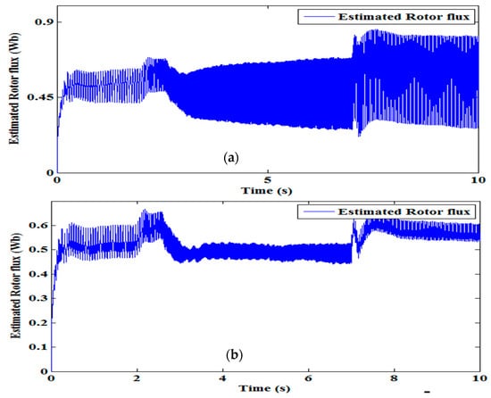 Even the estimated disturbance torque profile of SMLO 1 shown in Figure 16a is comparatively less smoother with more pulsations as compared to SMLO 2 shown in Figure 16b. The estimated rotor flux performance for SMLO 1 in Figure 17a and SMLO 2 in Figure 17b can be observed. Here again, the latter gives smoother flux performance in spite of variations in the commanded speed at different time intervals, resulting in better torque holding capability.