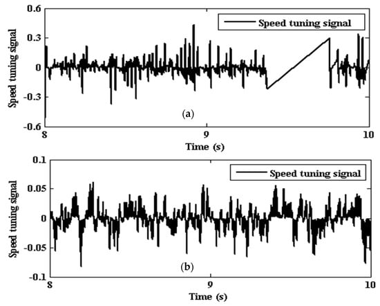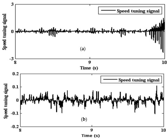 The detuning or incorrect setting of parameters plays a significant role in the ability of the adaptive mechanism to converge the states of the observer and motor. The stator resistance and rotor time constant play a critical role in the motor dynamics. Therefore, the speed convergence mechanisms of the observer are tested for incorrect settings of the said parameters. The speed tuning signal for the adaptive mechanism is derived from the difference between the products of the estimated d-axis flux linkages and the q-axis stator current error and q-axis flux linkages and the d-axis stator current error. For 50% incorrect setting in both, the convergence of SMLO 1 is shown in Figure 20a. The speed error gradually increases at the end, thereby affecting its ability to withstand parametric uncertainties, whereas, for SMLO 2, the speed error is approximately zero and consistent with time, as shown in Figure 20b.