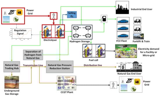 - Mukherjee, U.; Elsholkami, M.; Walker, S.; Fowler, M.; Elkamel, A.; Hajimiragha, A. Optimal sizing of an electrolytic hydrogen production system using an existing natural gas infrastructure. Int. J. Hydrogen Energy 2015, 40, 9760–9772. [Google Scholar] [CrossRef]