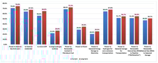 As shown in Figure 1, the surplus power can be converted into hydrogen by means of an electrolyser [29,37]. This hydrogen can then be directly utilized or converted to low-carbon methane which requires an additional process and consecutively results in higher cost and lower energy conversion efficiency. Each process or energy conversion/storage technology entails losses. The energy losses are acceptable in cases that the surplus electricity cannot be utilized for another application or its production must be curtailed (e.g., shedding of wind power, or dumping heat at nuclear power plants which take place in Ontario at this time). This hydrogen or low-carbon methane can be injected to natural gas pipeline to be used for residential heat purposes or for micro-combined heat and power systems (CHP) or for large-scale gas turbine, which has a lower CO2 emissions compared to the current conventional natural gas [38]. Moreover, in addition to that, hydrogen or HENG can be utilized for the low-carbon transportation applications (e.g., either natural gas vehicles running on HENG or hydrogen fuel cell vehicles). The utilization of the hydrogen can be seasonal or daily usage.
