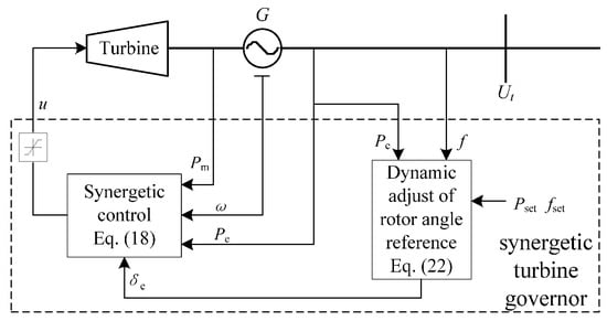 Equations (18), (20) and (22) together constitute a non-linear synergetic turbine governor, whose structure is shown in Figure 3.