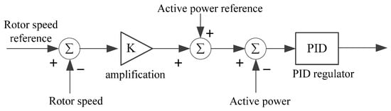 When the equilibrium point of the system changes after the disturbance, if the rotor angle reference value δe is kept constant, the active power output from the generator will change and deviate significantly from the active power value before the disturbance. In order to maintain the output active power of the generator in disturbance, a PI regulator can be designed to adjust the rotor angle reference δe dynamically according to the deviation of the active power of the machine. In this way, the rotor angle will follow the reference value δe to make active power deviation zero. However, grid generators generally need to participate in primary frequency modulation, and the relation between the rotor speed and active power in steady state can be described as: