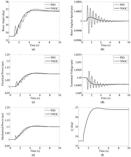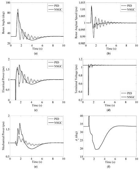 In this case, a three-phase short-circuit fault occurs in the start terminals of the transmission line at 1.0 s, and then one of the parallel transmission lines is switched off at 1.1 s, and the fault line recloses successfully at 1.7 s. The system responses to a three-phase short-circuit fault are shown in Figure 5. It can be seen that the maximum value of the rotor angle is smaller and the oscillation is weaker under the control of the NSGC than that of the PID governor. Figure 5e depicts the mechanical power, which is controlled by the turbine controller. The larger amplitude of the swing in the mechanical power indicates that the output of the NCGC is stronger than that of the PID controller.