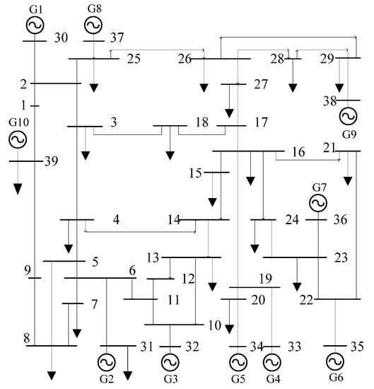 In this subsection, the New England system [40,41,42,43,44] shown in Figure 8 is applied to demonstrate the effectiveness of the NSGC in a multi-machine power system. All the loads are considered as the constant impedance model. The parameters of the NSGC for each generator are chosen to be k1 = 1.5, k2 = 0.02, T = 0.2 s. The parameters of the conventional PID governor are chosen to be Kp = 0.2, Ki = 3, Kd = 2.5.
