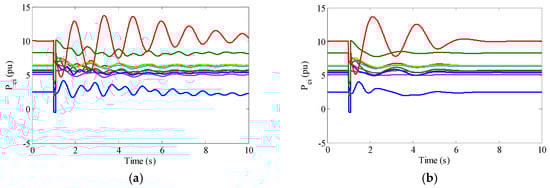 The responses of the electrical power, relative rotor angle, and relative speed to a three-phase short-circuit fault under operating condition 1 are shown in Figure 9, Figure 10 and Figure 11. Since the tenth generator is an external equivalent generator, bus 39 can be regarded as an infinite bus with a low impedance. Thus, only the relative rotor angle and relative speed of the G10 relative to other generators are shown in Figure 10 and Figure 11. It can be seen from Figure 11 that there are synchronous oscillations between G1–G9 and G10. Under the control of PID governors, the oscillation attenuation is slow and the system is still not stable at the end of the simulation. While under the control of the NSGCs, the oscillations are coming to an end at 7 s and the system returns to the equilibrium point. From Figure 10, it can also be found that the proposed NSGC can reduce the amplitude of the first swing of the rotor angle and improve the transient stability of the system.