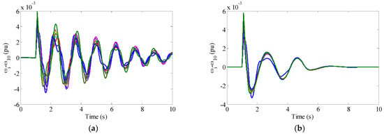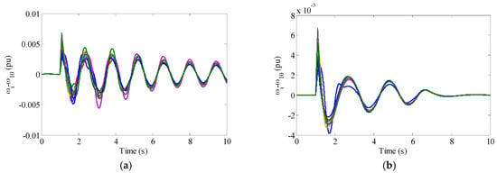 Rotor speed ωi-ω10 response against a short circuit under operating condition 2. (a) Conventional PID governor controller; (b) Nonlinear synergetic governor controller.