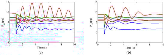 Electrical power response against a short circuit under operating condition 2. (a) Conventional PID governor controller; (b) Nonlinear synergetic governor controller.