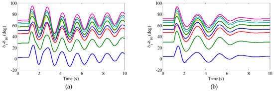 Rotor angle δi-δ10 response against a short circuit under operating condition 2. (a) Conventional PID governor controller; (b) Nonlinear synergetic governor controller.