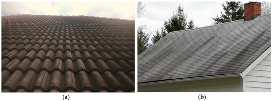In this context, reflective roof or insulation coatings have been utilized for increasing the energy savings potential of building envelopes, and several studies can be found in the literature, such as [18,19,23,24,25,26,27]. Nevertheless, due to the low cost, concrete or ceramic tiles are widely used in roofs in Brazil. Those tiles enable mould or algae to grow and normally no paint layer or impermeable films (Figure 1a) are provided. In asphalt roofing shingles found widely in European and North American buildings, this phenomenon is commonly observed (Figure 1b). The mould growth decreases the tile durability, worsens the aesthetic appearance of buildings and increases the solar absorptivity.