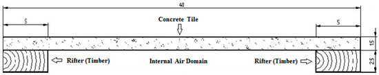 The roof analyzed is composed of concrete tile (1.5 cm) and two rifters (2.5 cm) as shown in Figure 3. The hygrothermal properties have been obtained from [43] for concrete and from IEA Annex 14 Report [44] for timber (rifters). The internal emissivity was considered equal to 0.9 for both concrete tile and timber roofs, and the solar absorptivity equal to 0.6 has been adopted.