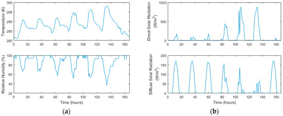 Weather data for the first week of July (winter period) for Curitiba, Brazil: (a) temperature and relative humidity; (b) direct and diffuse solar radiation.