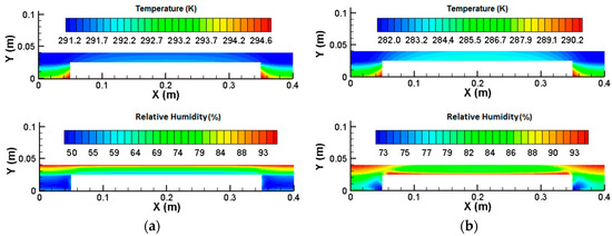 Temperature and relative humidity profiles in the roof at midnight: (a) on 7 January; (b) on 7 July.