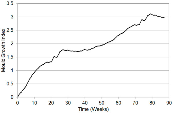 In order to confirm the possibility of mould growth on concrete tile, the mould index evolution is reported in Figure 7 as the results of the simulation using the numerical model presented in Section 3. Some mould growth can be detected visually after 76 weeks (Curitiba climate). A small decrease in the mould index is observed after the winter period. This work has been limited to 85 weeks due to the high computational time required and to the fact that according to the mould growth risk model (Section 2.3), mould would visually appear in less than 85 weeks.