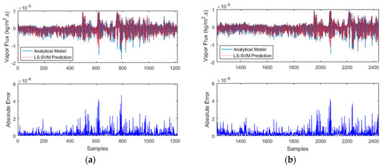 Figure 9 and Figure 10 present the comparison between the LS-SVM model and the numerical method in terms of prediction. Figure 9 presents both training and test phases for outputs 1 (vapor flow) and 2 (sensible heat flow), while Figure 10 shows the results for outputs 3 (latent heat flow) and 4 (mould growth risk). The absolute error is also presented in these figures. Additionally, Table 2 reports the values of the Multiple Correlation Coefficient for both training and test phases.