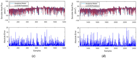 Comparison between the numerical and the LS-SVM models (a) output 1: vapor flux—training phase; (b) output 1: vapor flux—test phase; (c) output 2: sensible heat flux—training phase; (d) output 2: sensible heat flux—test phase.