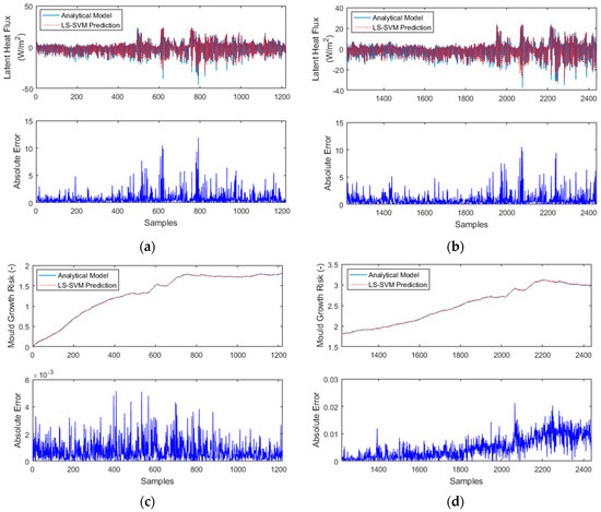 As can be observed in Figure 9 and Figure 10, the highest absolute error values can be found in the mould growth index approximation, which can be justified by the different in the dynamic of the mould growth model. As the index provides different growth behavior in distinct stages of growth, those defined by distinct equations, all these stages should be used in the LS-SVM training stage. As the LS-SVM training data set presented in this work adopted only the behavior between the values of (Figure 9c), the model was still capable of reproducing mould growth with considerable precision.