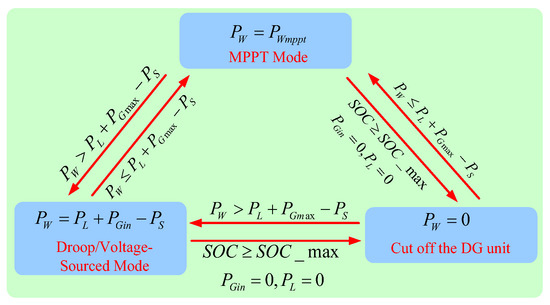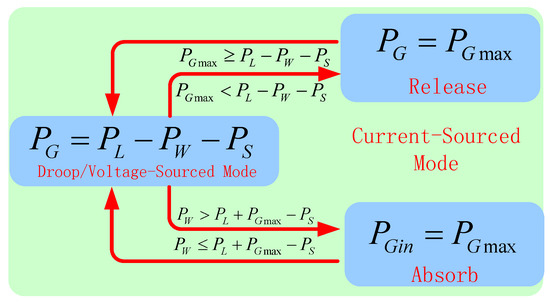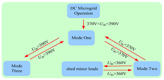 Additionally, in the coordinated control of the system layer, the improved hierarchical/droop control strategy based on the DC bus voltage introduced in this paper is employed, so as to ensure the power flow balance of the microgrid in different hierarchical zones. The operational modes are shown in Figure 8.
