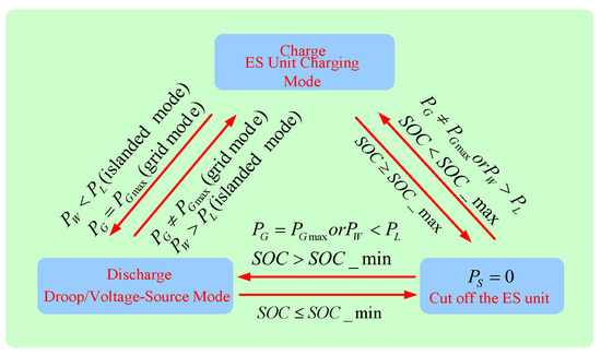 Figure 4. Schematic diagram of ES battery mode-switching. - Load: The DC and AC loads are connected with the DC microgrid through a DC/DC converter and DC/AC converter, respectively. The loads unit switches its operation mode as shown in Figure 5. When power supply is insufficient, load-shedding control in terms of loads priority is needed to ensure power balance of the DC microgrid and power supply quality of the important loads.