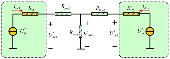 where is the no-load voltage of distributed sources and and are the output voltage and current of the distributed source i, respectively. is the droop coefficient. In Figure 6, Rline1 and Rline2 are line resistances of the distributed sources.