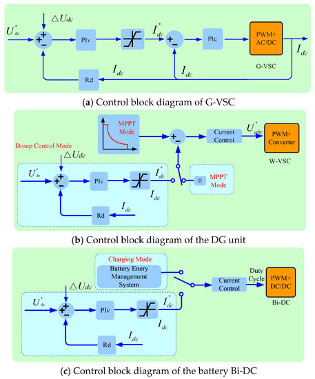 Table 1. Symbols in Figure 2. - Distributed generation unit: The DG unit is composed by the wind turbine generator system and photovoltaic generator system, which are tied with the DC microgrid by a DC/DC converter and a voltage-sourced converter Wind-Voltage Sourced Converter (W-VSC), respectively. In Figure 3, the switching process of the DG unit in different modes is illustrated. In order to capture the most wind and solar energy possible, the DG unit works in the MPPT manner normally, enhancing the energy utilization efficiency. When the wind and solar are sufficient and the DG unit output is large, the DC bus voltage rises, and the operation mode will switch to droop control to sustain the voltage stability. The DG unit will shut down if the main network is not connected, all loads are shed and the battery is fully charged.