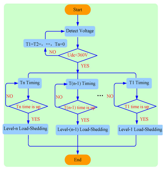 According to the load priority, loads can be sorted into n levels: Level-1, Level-2, Level-3, …, Level-n, and the level is greater as the value of n is smaller. Loads in n different levels all have the corresponding cut-off time, and T1 > T2 > T3, …, > Tn. When the bus voltage is detected below 360 V, all timers start. If the timer of Level-n reaches Tn, then the loads of Level-n are shed immediately. After load-shedding, T1, T2, T3, …, T(n − 1) will be cleared if the DC bus voltage returns to normal, while the loads in Level-(n − 1) will be cut off if the voltage is still under 360 V and it continues to T(n − 1). The rest can be done in the same manner. The load-shedding process is shown in Figure 10.