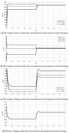 Figure 11a,b presents the power and current waves of DGs under the conventional and improved control, respectively. From the figures, before t = 1.0 s, large deviation exits both in the output power and current of DG units under the conventional control due to the differences among different feeder resistances. The output power difference between DG1 and DG3 is 1000 W. After t = 1.0 s, the output steady-state currents of the DG units with the same capacity are almost the same, and the output powers are exactly the same; the circulating current is nearly zero. Figure 11c,d displays the output voltage and public bus voltage of the DG units under conventional and improved control, respectively. Under the conventional control strategy, the output voltages of different DG units are 356 V, 353 V and 351.5 V, respectively. The output voltage is relatively low because of the droop control strategy, which affects the system voltage level. However, after t = 1.0 s, the current-sharing term constructed in the new method not only achieves power-sharing, but also improves the system voltage by 10 V. Moreover, the public bus voltage is improved to some extent, enhancing the system voltage stability on the whole.