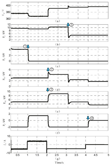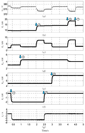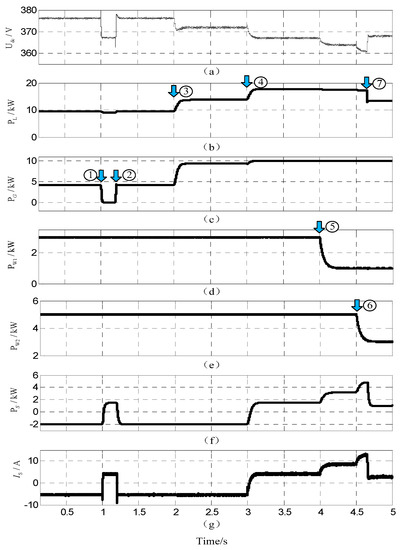 Figure 13. Simulation waves of Simulation 2: (a) DC bus voltage; (b) load power; (c) output power of G-VSC; (d) output power of the WT generation system; (e) output power of the PV generation system; (f) power released(+)/absorbed(−) of the battery; (g) discharging(+)/charging(−) current of the battery.