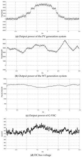 In order to verify the voltage stability of actual PV and WT generation in the DC microgrid, actual data of PV and WT generation are used in this case. The DC microgrid system operates in Mode 1. In the Figure 15, in the time interval t = [1.5 s, 2 s], the PV gets the maximum illumination, with an output of 5 kW or so, while the output of WT generation is stochastic, changing within [3 kW, 5.8 kW]. The rest of the demanded power is provided to the load by the grid-connected inverter G-VSC, ensuring the common bus voltage within in a certain range, which verifies the stability of the DC microgrid voltage.