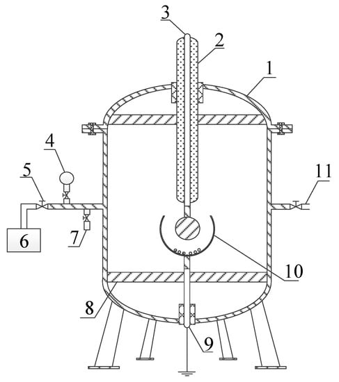 Structure of PD gas chamber: 1: gas chamber; 2: High-voltage (HV) bushing; 3: HV conductor; 4: ball valve; 5: vacuum pressure gauge; 6: vacuum pump; 7: injection port; 8: support insulator; 9: ground conductor; 10: insulation defect; and 11: sampling port.