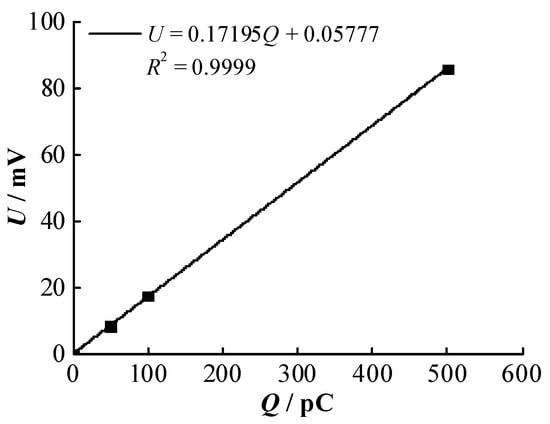In the PD signal detection system, the coupling capacitor (Ck) is used to extract the pulse current, and the non-inductive impedance (Zm) is used to convert this pulse current into a pulse voltage, which is sent to the digital storage oscilloscope (DSO, WavePro 7100XL, Lecroy, New York, NY, USA, analogue band: 1 GHz, sampling rate: 20 GHz, memory depth: 48 MB). This research uses the PD calibration circuit recommended by IEC 60270:2000 to calibrate the PD magnitude [48], and the calibration curve obtained is shown in Figure 3.