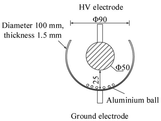 Many types of insulation defects might occur in DC-GIE; however, the most common defect is free metal particles, which is metal powder that can move freely in a cavity. As shown in Figure 4, a ball-bowl electrode, which consists of a ball electrode, a bowl electrode, and 20 aluminum balls (mass fraction of C element: 0.88%), is developed to simulate the particle defect. The ball and bowl electrodes form a concentric sphere structure and are made of stainless steel (mass fraction of C element: 0.10%). The diameter of the ball electrode is 50 mm. A hollow sphere is cut to obtain the bowl electrode with a thickness of 1.5 mm. The diameters of the hollow sphere, circular incision, and aluminum ball are 100, 90, and 3 mm, respectively.