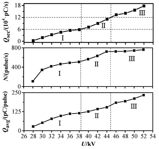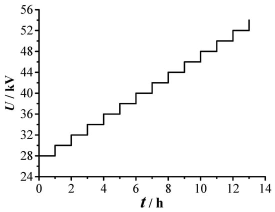 The initial PD voltage Ug of the equipment without the particle defect is 82.2 kV. After placing the defect in the gas chamber, the initial PD voltage U0 and breakdown voltage Ub of the equipment are 27.5 and 53.8 kV, respectively. The PD experiment is conducted under the grading voltage (Figure 5) to study the PD characteristics of the whole process when the applied voltage is increased. A total of 100 groups of PD signals are collected under each voltage value, and the PD parameters are obtained by averaging the three repeated experiments to ensure that the experimental results are statistically significant. Among the PD parameters, the discharge amplitude and repetition rate are two important features that can characterize the PD severity. The average discharge magnitude in a second (Qsec, unit: pC/s) is selected as the characteristic quantity of PD severity to comprehensively consider the influence of these two parameters on PD development [26,27]. Qsec is calculated using Equation (1).
