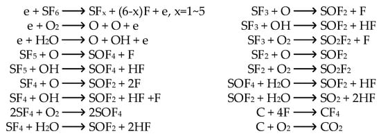 SF6 possesses excellent insulating and arc-extinguishing performance and is widely used as a medium in gas-insulated equipment (GIE) because of its ability to greatly reduce the equipment size and improve system reliability [1,2,3,4,5]. DC-GIE received much attention due to the rapid development of high-voltage DC (HVDC) transmission and flexible HVDC technologies [6,7,8,9,10,11]. However, when partial discharge (PD) occurs inside the equipment, this phenomenon can decompose SF6 and generate a series of low-fluorine sulfides (such as SF5, SF4, SF3, and SF2). These low-fluorine sulfides then react with the trace moisture and oxygen that inevitably exist in the equipment, thus generating some stable decomposition products, such as SO2F2, SOF2, SO2, CF4, CO2, HF, and H2S and resulting in the insulation performance degradation of SF6 [12,13,14,15,16,17]. Using SF6 decomposed component analysis (DCA) to diagnose the insulation faults in DC-GIE and assess its insulation status can effectively avoid the complex electromagnetic interference in the substation; this method has recently become a popular topic for researchers around the world [18,19,20,21].