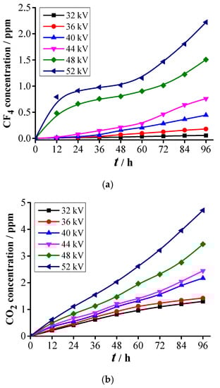 The formation process of SF6 decomposed components is shown in Figure 7 [24]. CF4 is generated through the reaction of C atom with F atom. Under the effect of the electric field, the charged particles hit the surface of the stainless-steel electrodes and aluminum balls to release the C atoms, as well as hit the SF6 molecules and break six S-F bonds to generate F atoms; both processes require high-energy collision ionization. By calculation [50], the energy of the charged particle is low when the voltage U ≤ 36 kV [26,27]. Therefore, when the voltage U ≤ 36 kV, only a small amount of C atoms and F atoms are generated from the collision ionization, and the CF4 concentration increases slowly with time (Figure 8a). When the voltage U > 36 kV, the energy of the charged particle increases. Thus, the growth rate of CF4 concentration also increases. In particular, the CF4 concentration quickly increases after 60 h. Limited F atoms are produced within 60 h. Thus, these limited F atoms have high possibility of reacting with metal and generate metal fluoride as compared with C atoms. This phenomenon limits the formation of CF4 to some extent. After 60 h, the formed C atoms and F atoms continue to accumulate, and the excess F atoms will react with the C atoms and produce CF4. Thus, the growth rate of CF4 concentration accelerates.