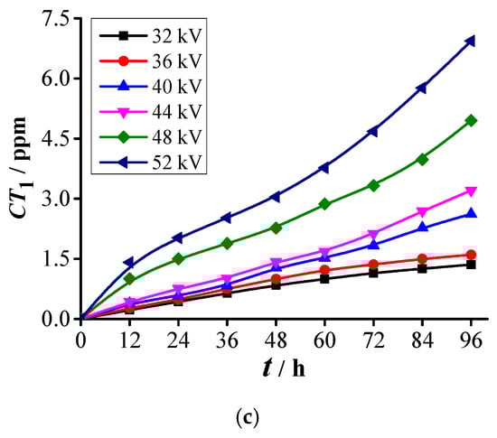 where C(CF4) and C(CO2) represent the concentrations of CF4 and CO2 (unit: ppm), respectively. As shown in Figure 8c, when mild PD (32 and 36 kV) occurs, CT1 shows a saturated growth trend at the end of the experiment. When medium PD (40 and 44 kV) occurs, CT1 presents an approximately linear growth trend with time. When dangerous PD (48 and 52 kV) occurs, CT1 shows an approximately “J” growth trend at the end of the experiment. The change curves of CT1 differ under three different PD levels. Thus, CT1 can be associated with the PD severity.