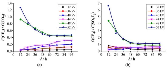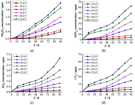 SO2F2 is mainly produced through the reaction of SF2 with O2. The average O2 concentration on the six experiments in the gas chamber is 1080 ppm. The sum of the concentration of the oxygen-containing components (CO2, SO2F2, SOF2, and SO2) is less than 72 ppm, which indicates that O2 is abundant in the formation of SO2F2. Thus, the formation characteristic of SO2F2 is mainly determined by the SF2 concentration produced. Under the effect of the electric field, the charged particles hit the SF6 molecules and break four S-F bonds to generate SF2, which requires high-energy collision ionization [26,51]. The energy of the charged particle is not high when the voltage U ≤ 48 kV (Figure 9a). Therefore, the amount of the produced SF2 is small, and the SO2F2 concentration grows slowly within 24 h. However, the SF2 formed continues to accumulate with time, and the SO2F2 concentration presents an approximately linear growth trend after 36 h. When the voltage increases to 52 kV, the SO2F2 concentration shows an approximately linear increase with time. However, when the experimental voltage U ≤ 52 kV, with increasing voltage, the SO2F2 concentration remains less than 2 ppm, which illustrates that the SF2 generated under the PD initiated by the particle defect can only produce a small amount of SO2F2.