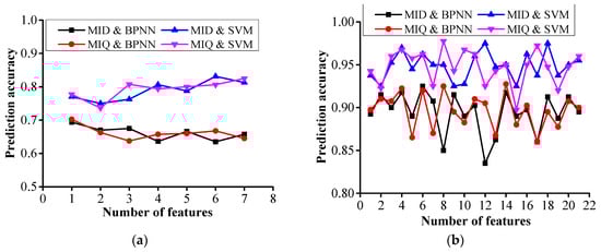 In summary, the mRMR-based feature selection algorithm has two principles: (1) the MID principle, which requires the largest value of D (the mutual information between the feature and the category) minus R (the mutual information between the features) as shown in Equation (8); and (2) the MIQ principle, which requires the largest value of D divided by R as shown in Equation (9).