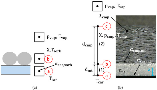 The heat transfer in the metal domain (1) is described with a heat conduction equation with the state variable . At Boundary c, the enthalpy of the incoming water vapor during adsorption is taken into account. The metal plate (1) and composite (2) are connected via the boundary condition in Equation (16), taking into account a contact resistance between them.